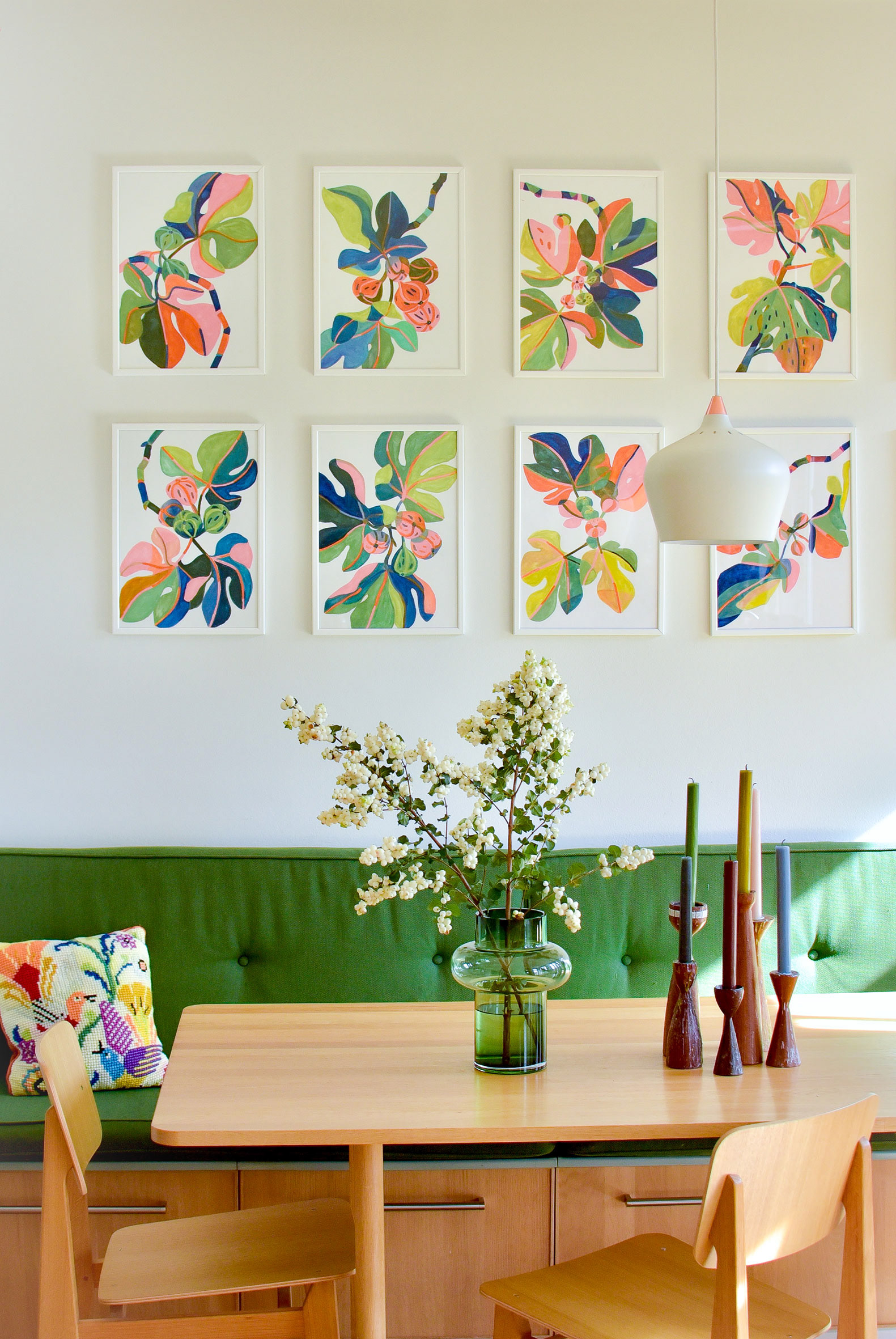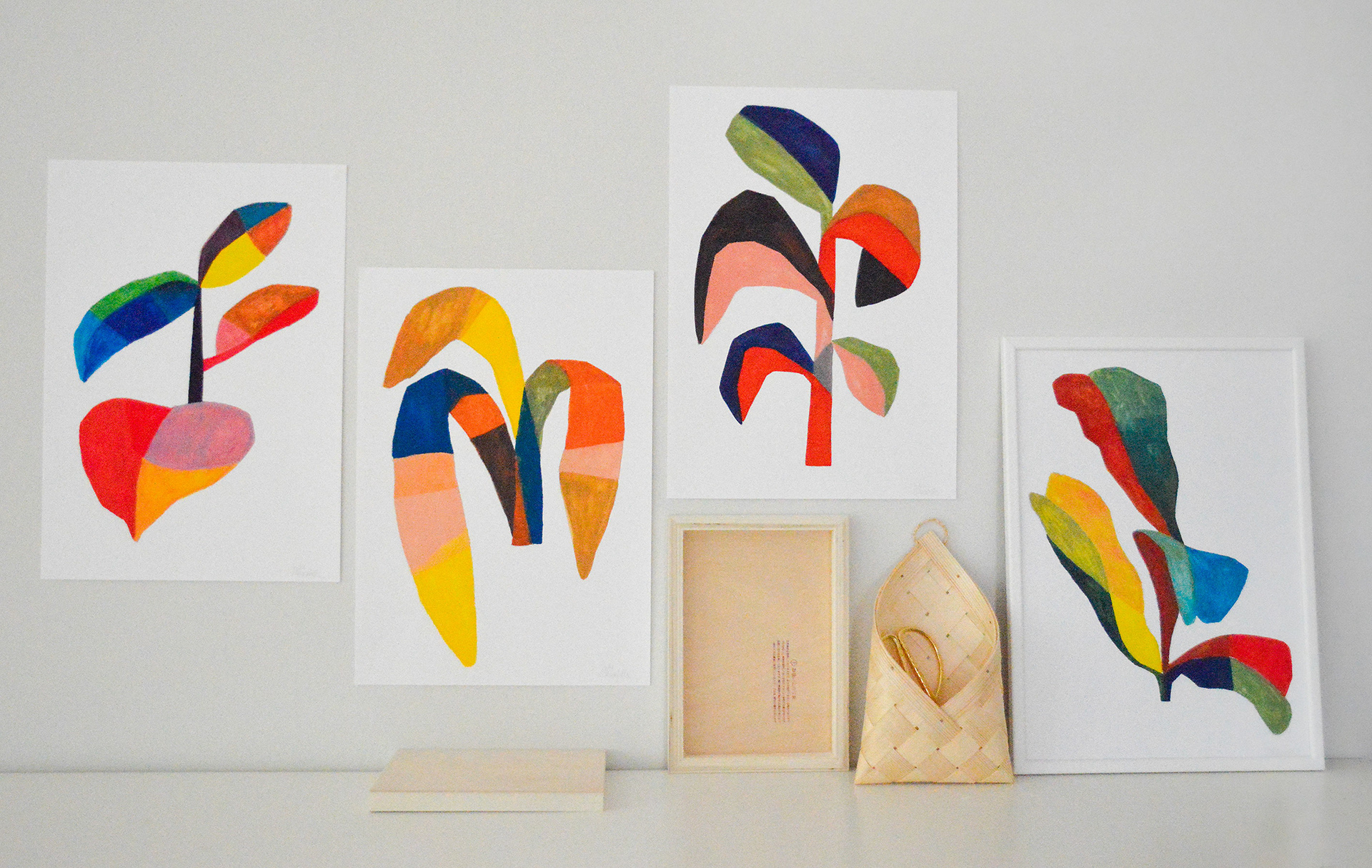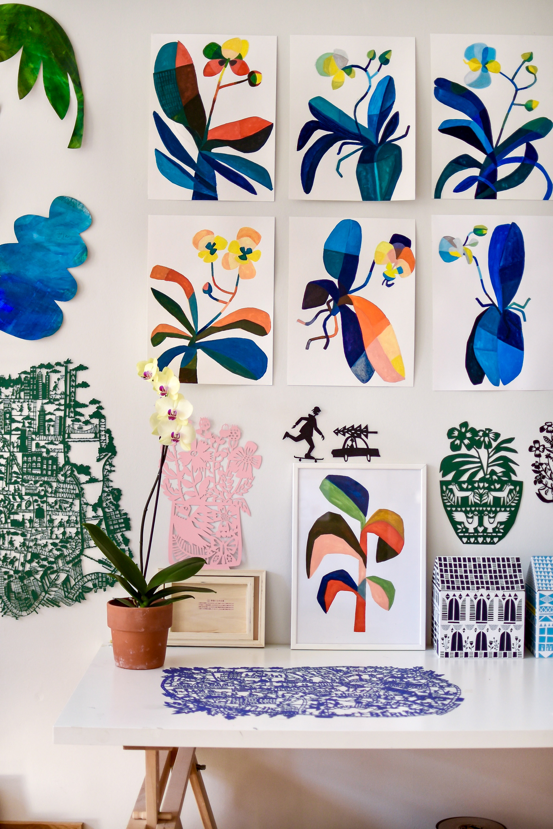 This collection celebrates my love for botanicals, from paper cuts to drawings and paintings of plants, flowers, and leaves in all shapes and sizes. I often work in series, like my fig leaf paintings or large-scale plant cut-outs, painted and hand-cut from rolls of wallpaper. Each piece is an exploration of nature’s forms, colour, and rhythm, brought to life through playful, layered craftsmanship.
