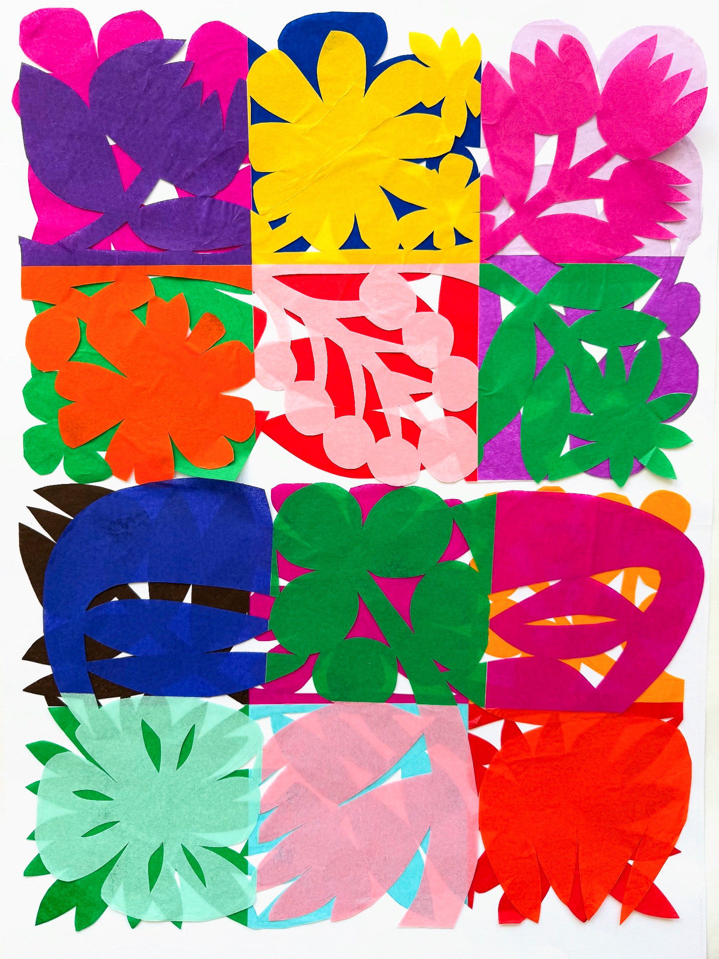 Cut-outs of flowers on colourful tissue paper inspired by Mexican folk art.