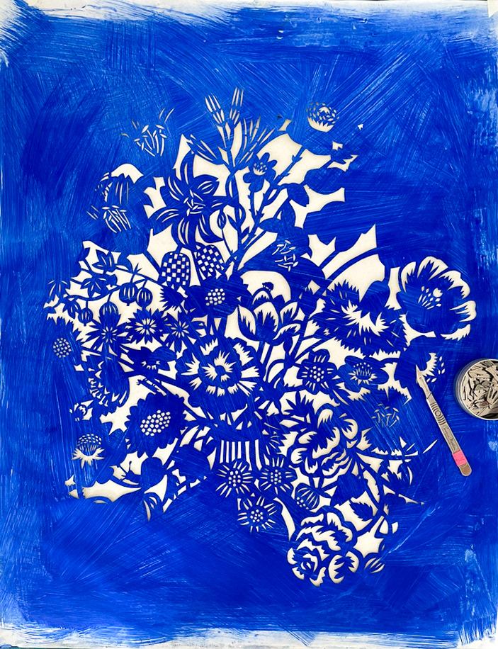 Bouquet in vase cut in a large sheet of paper. Inspired by Dutch flower paintings